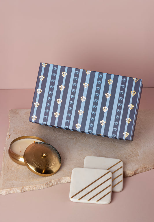 Matte Gold Embossed Jasmine Scented Candle & Marble Strips Brass Inlay Coasters (set of 2) - Gift Set