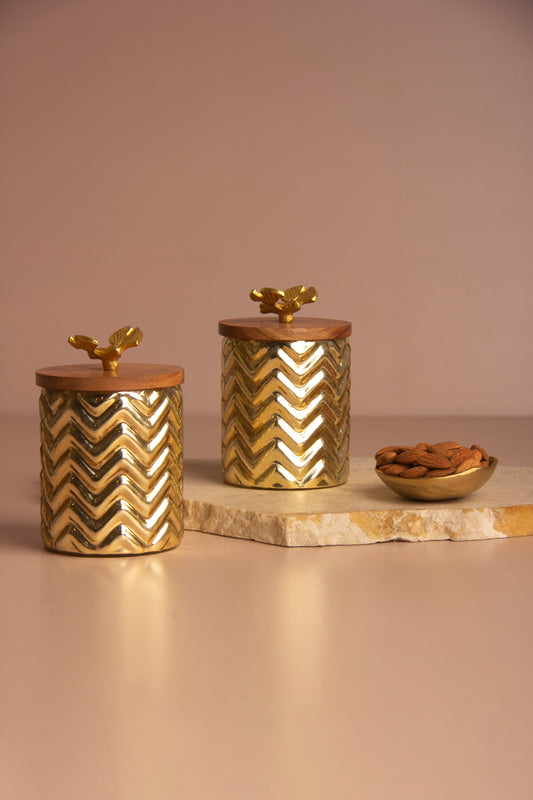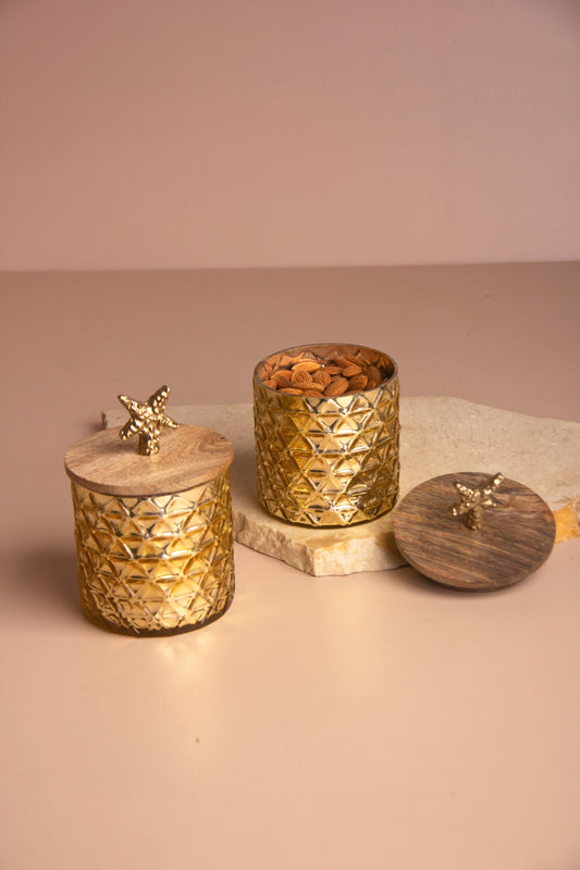 Gilded Triangle Gold Glass Jar with Wooden lid - Set of 2