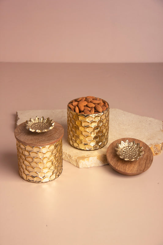 Gold Gleam Hive Glass Jar with Wooden lid - Set of 2