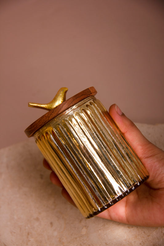 Lumi Gold Ripple Glass Jar with Wooden lid - Set of 2