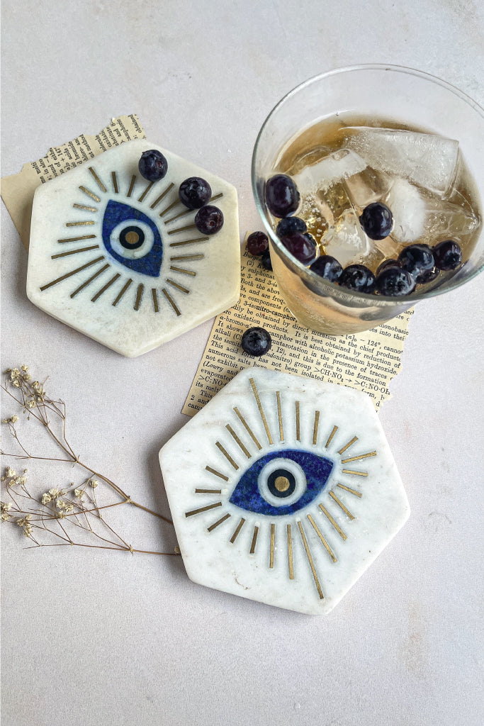 Description Keep negative energy at bay with our Evil Eye natural marble coasters! Handmade in India with blue Lapis stone and brass inlay work, these set of 2 hexagonal coasters are a stylish addition to your space.