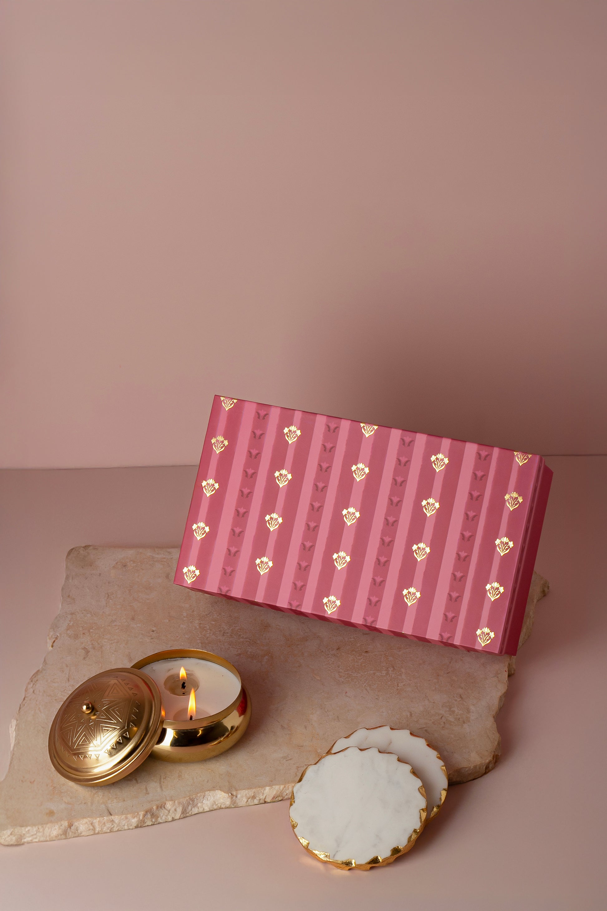 With its gleaming gold glossy look and dual wicks, this candle is a charm, handcrafted in India, ready to change the ambience of your space with a soothing jasmine fragrance. Housed in a reusable container, it seamlessly blends style with sustainability. The best part? This candle comes in a gift set also containing a pair of Marble coasters with intricate gold foiling around the edges.