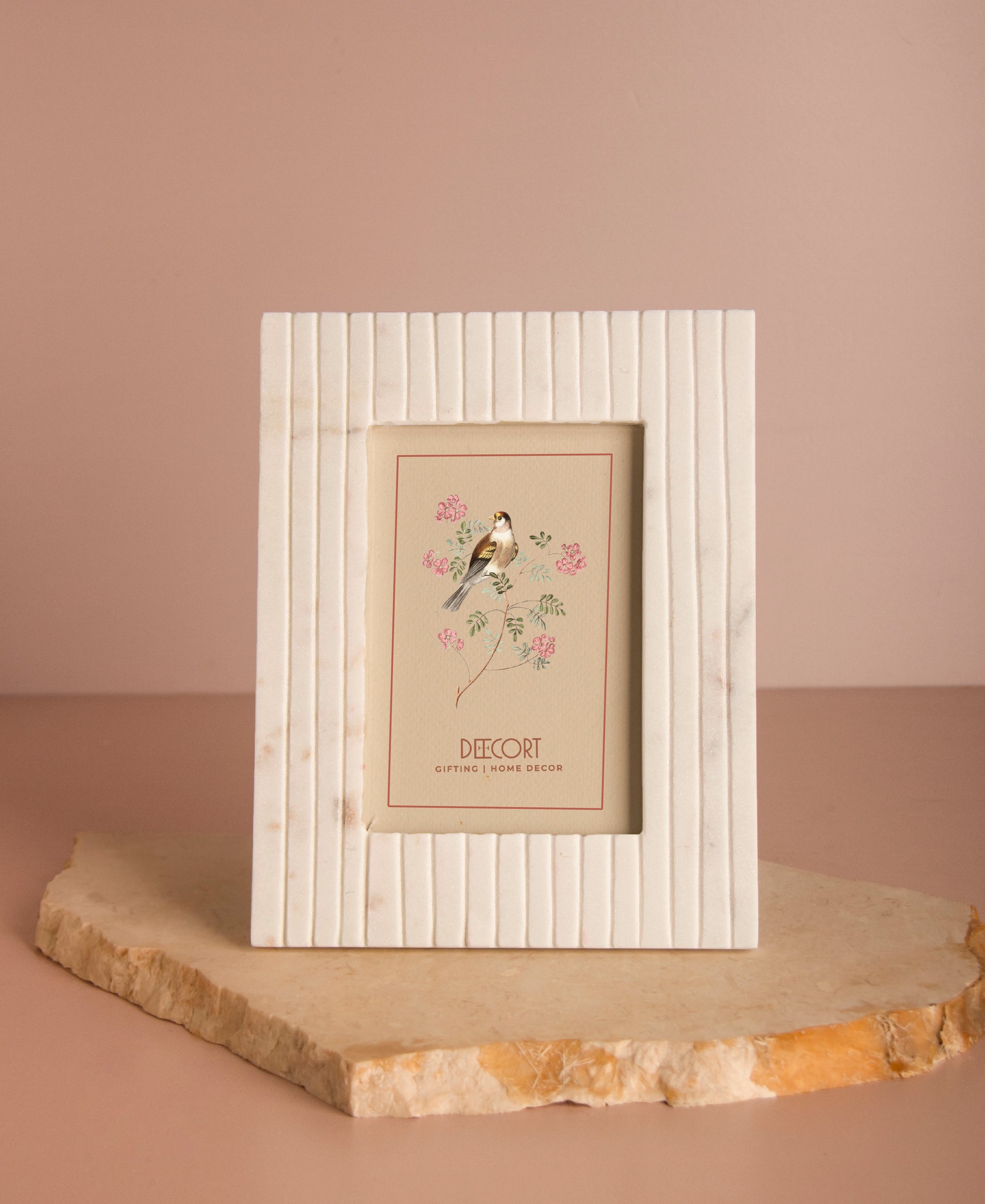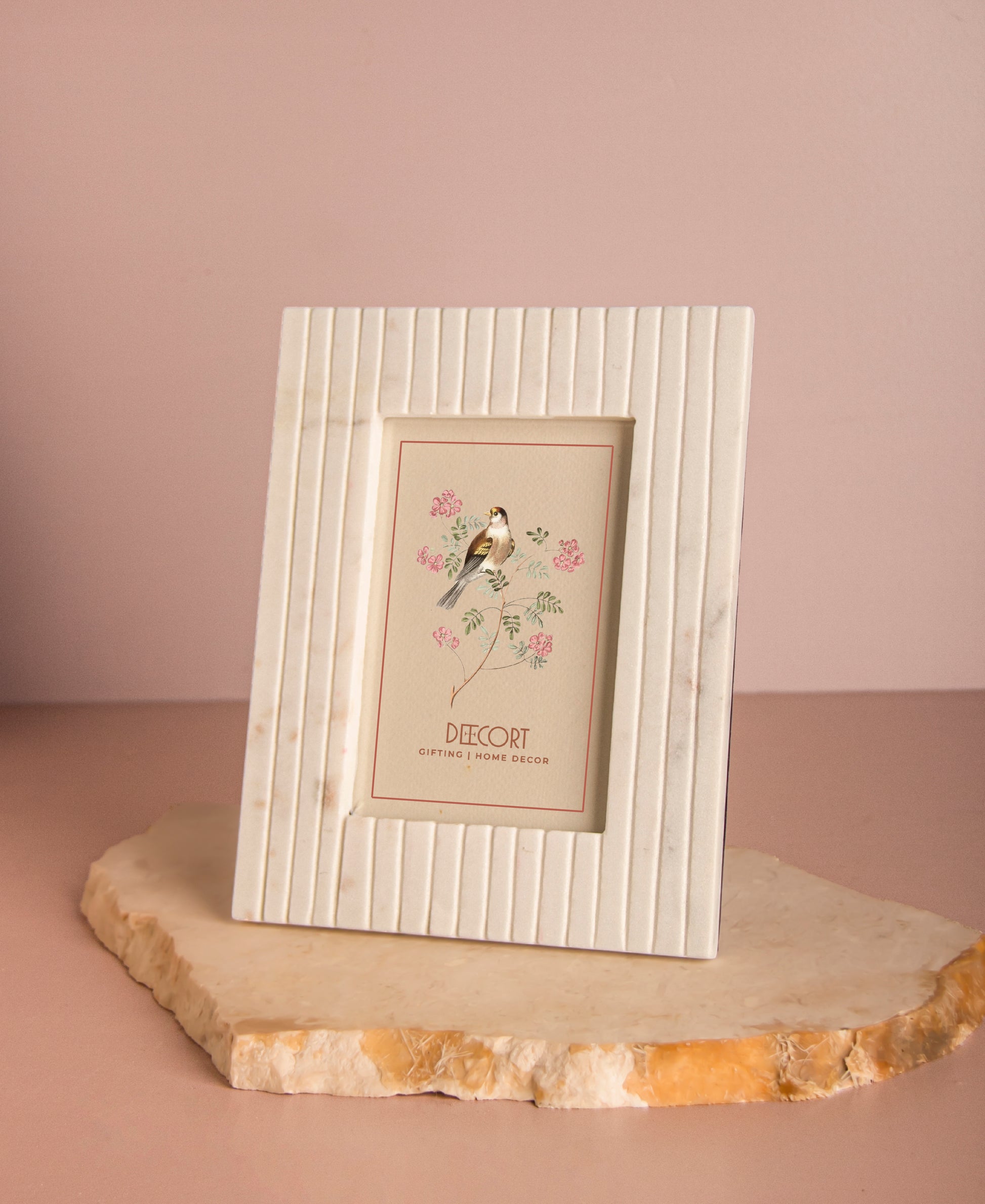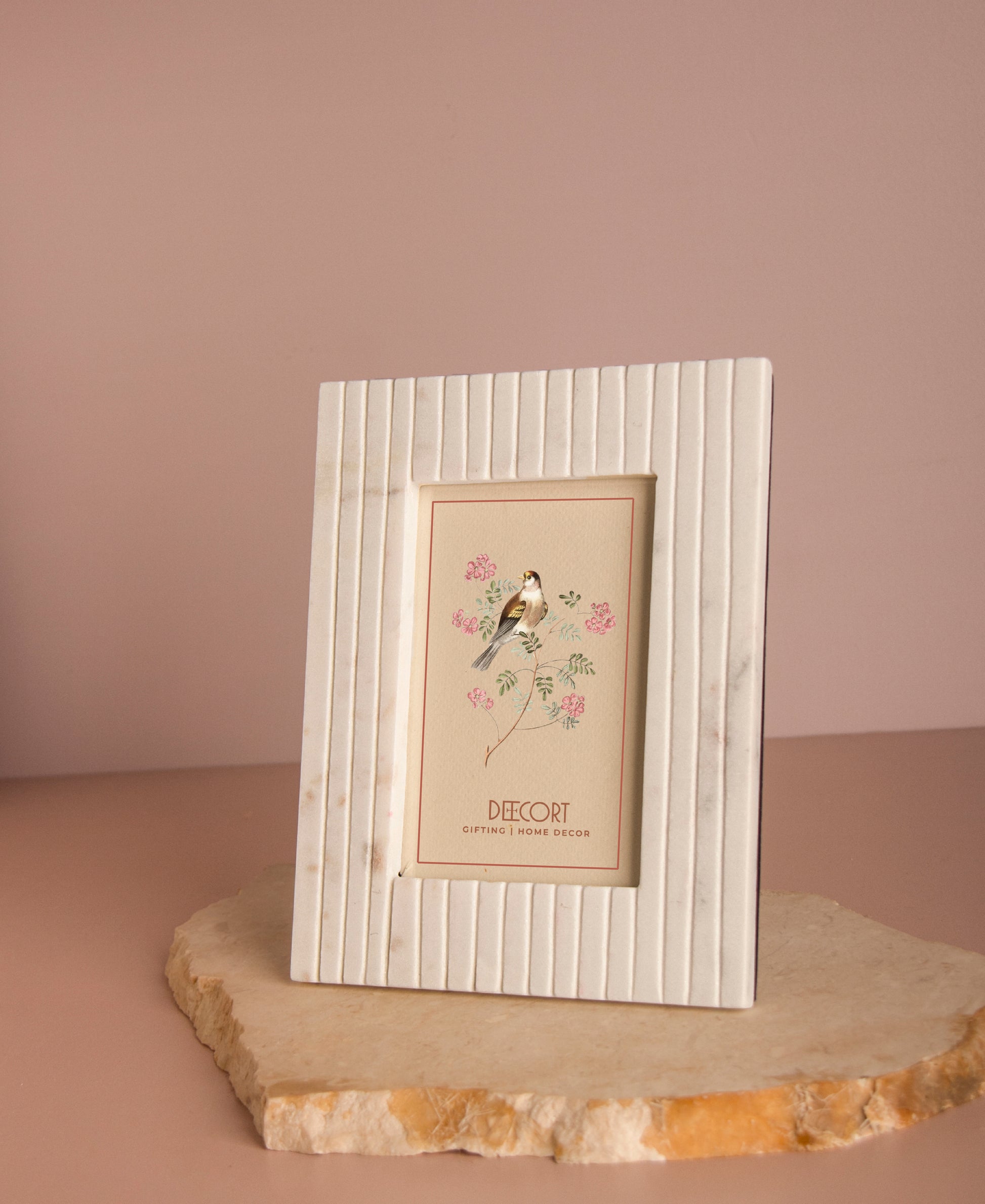 Description :- Elevate your interiors with this elegant handcrafted marble photo frame, featuring a timeless fluted design. Meticulously crafted by skilled artisans, this frame perfectly fits a 4x6 inch photograph, with an overall outer size of 9x7 inches — ideal for mantelpieces, desks, or shelves. The vertical ridges of the fluted texture enhance its minimal yet luxurious aesthetic, making it a versatile piece that complements both modern and classic décor styles.