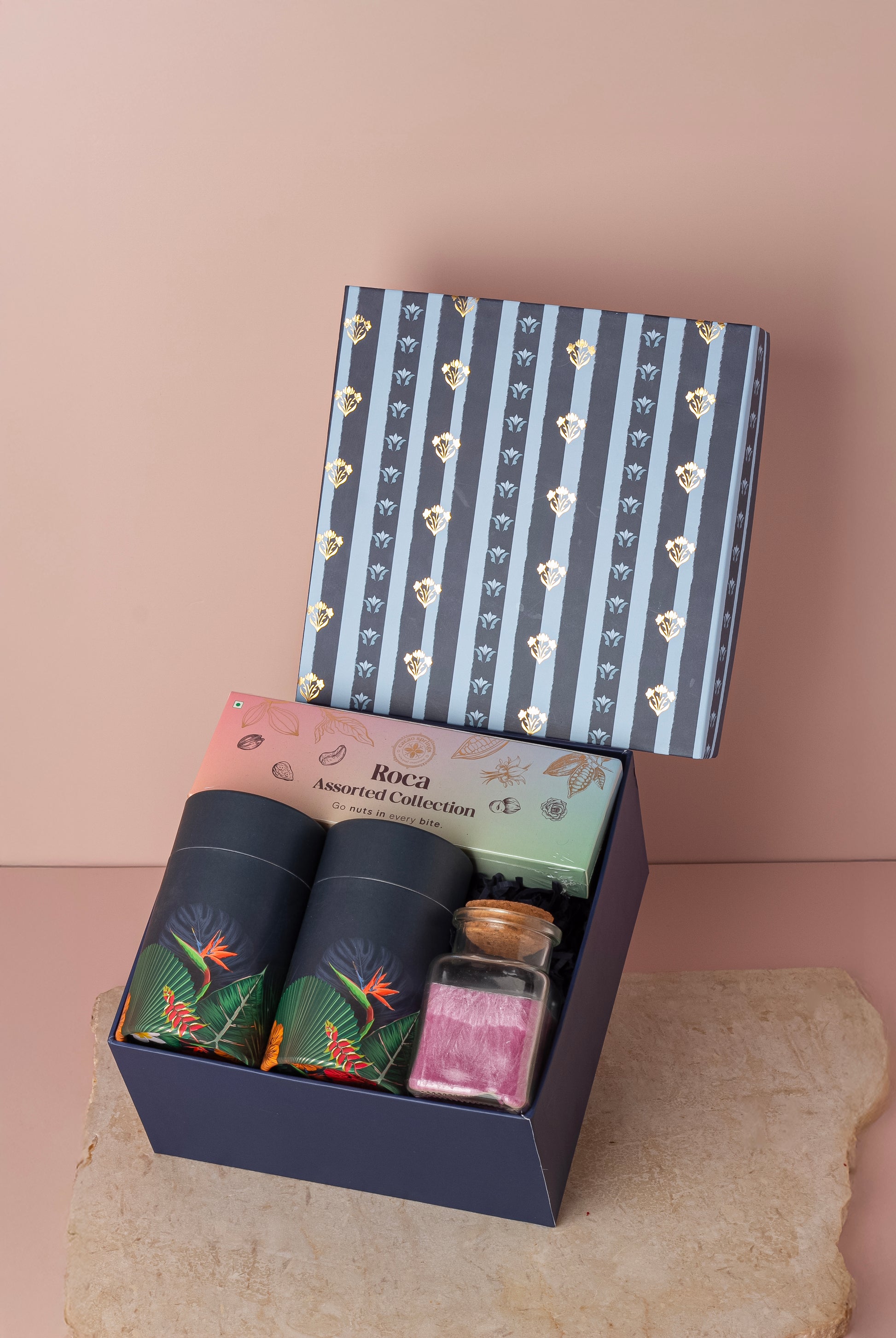 Description - The Noor Hamper is designed to light up celebrations with elegance. It carries a lavender-scented glass candle, two jars of flavoured dry fruits for festive sharing, and artisanal chocolate for a touch of indulgence. A curation that feels modern, refined, and just right for Diwali gifting. Add a customised note to make it personal.