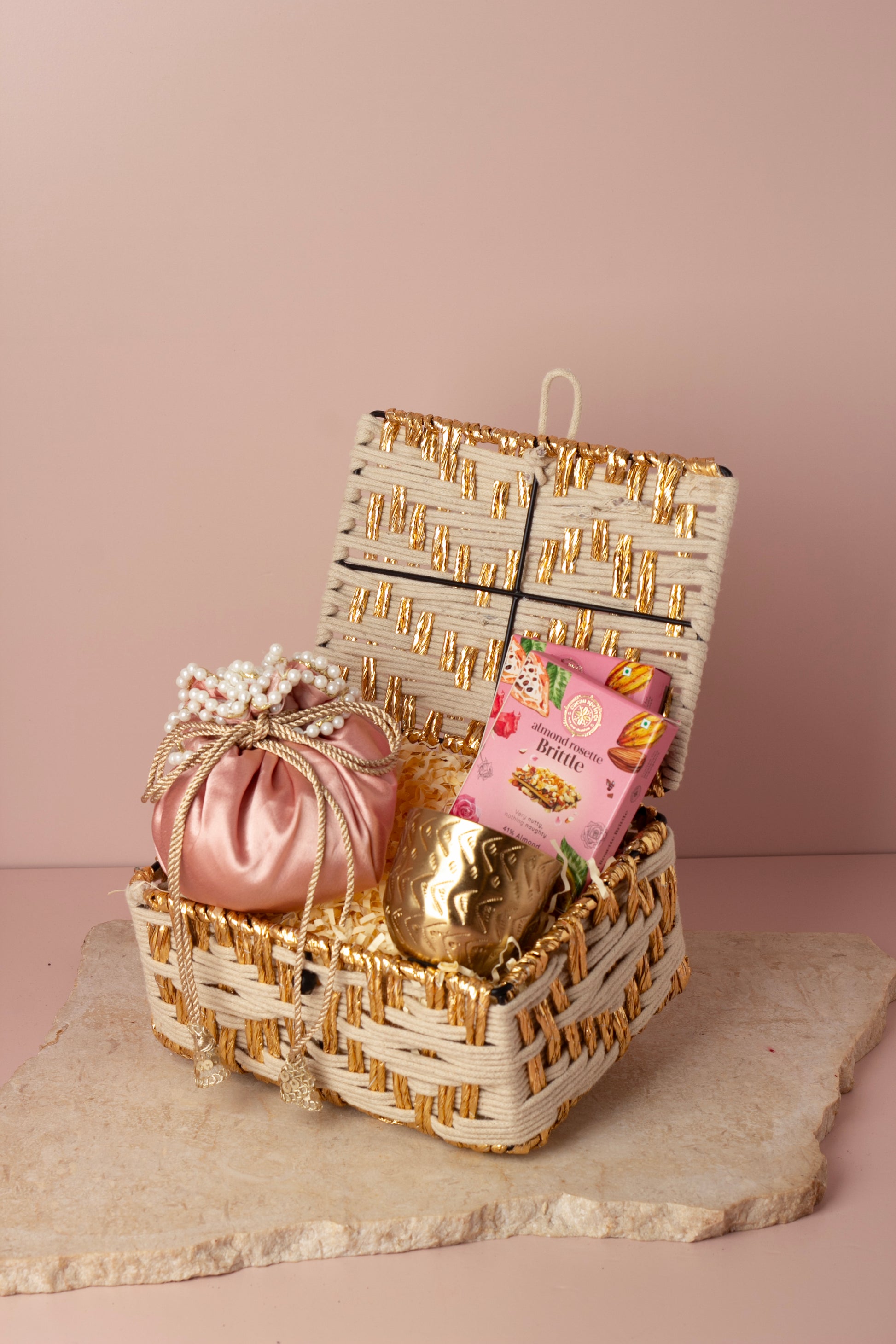 Description - In the Ivory Gold Weave Hamper, a jasmine-scented candle brings a surreal touch, a festive potli of flavoured dry fruits adds crunch, and artisanal chocolates finish the moment. A sustainable hamper that feels simple, graceful, and personal. Add a customised note to make your wishes truly yours.