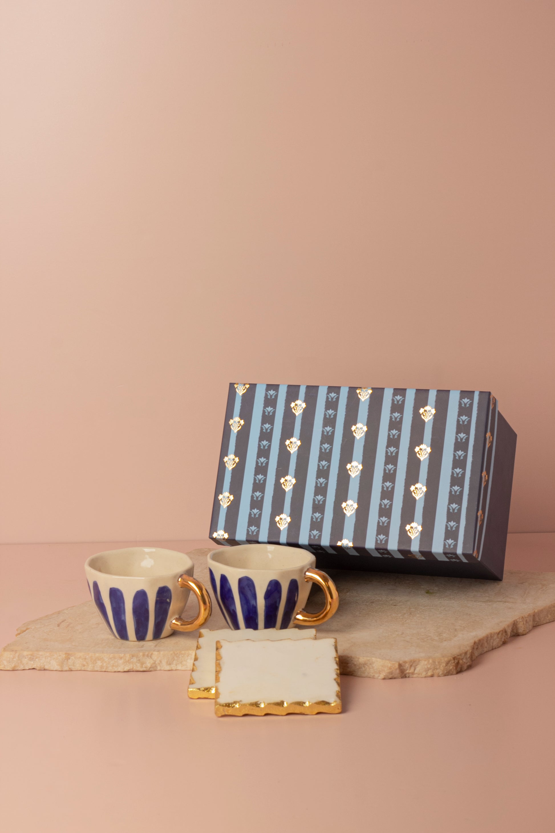 Add elegance to your drinkware collection with this refined set of two ceramic cups, featuring hand-painted deep blue patterns and luxurious gold-plated handles. The set is paired with two square marble coasters accented with shimmering gold borders, offering both style and functionality. Beautifully packaged in a premium gift box, it makes a thoughtful and impressive gift for weddings, festivals, and corporate events.