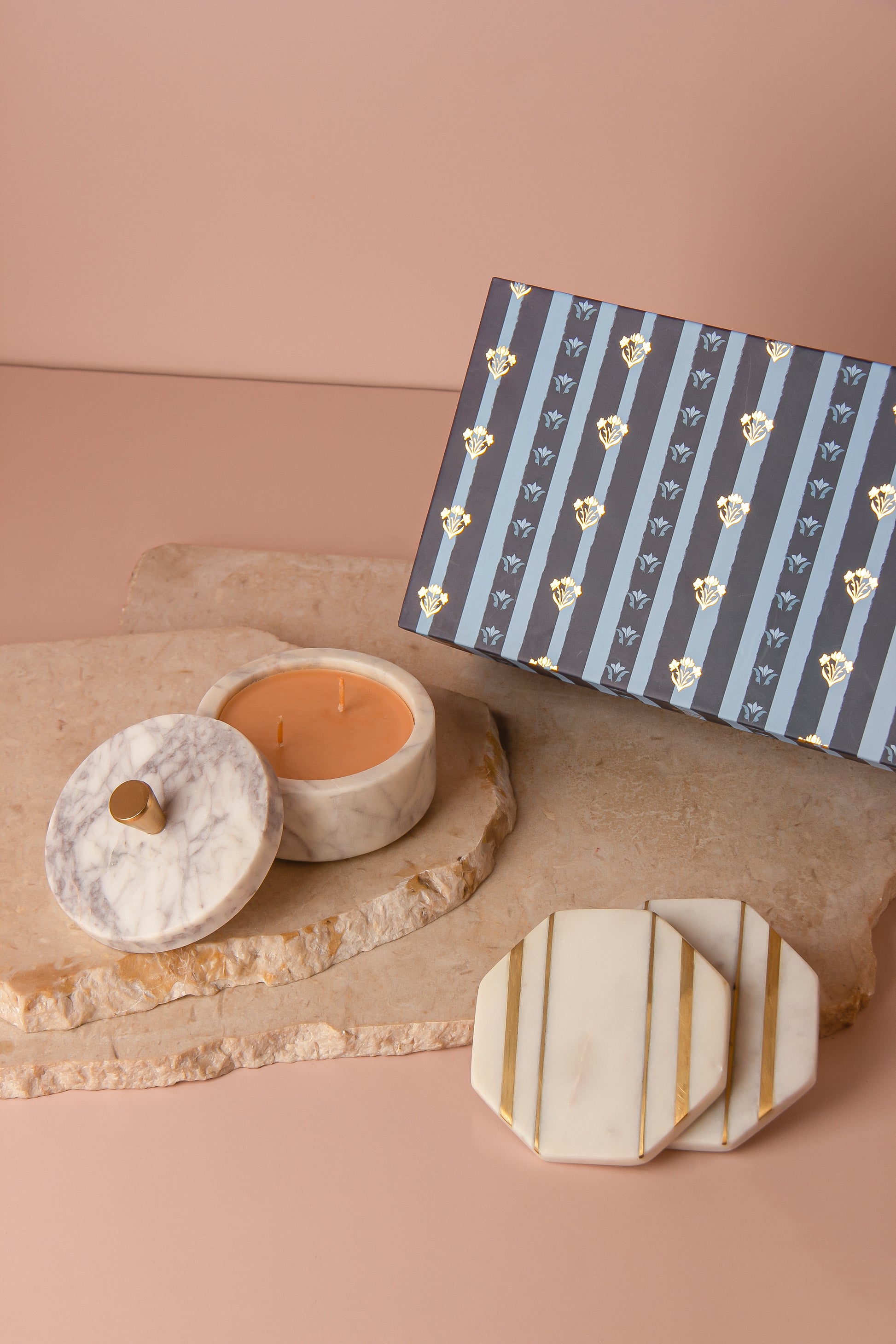 1 Marble Scented Candle & 1 Set of coasters (2 pieces).