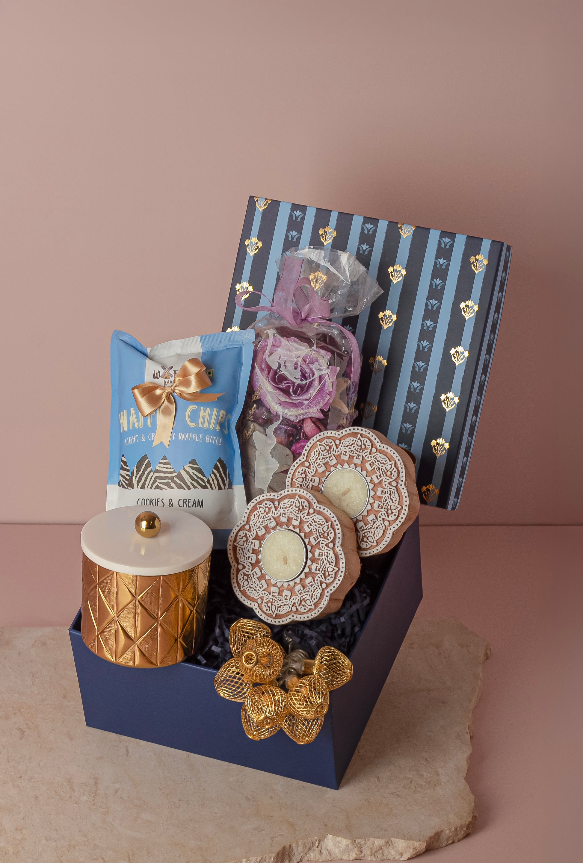 Description - The Noor Luxe Hamper holds a curation that blends glow, flavour, and festive craft. Preserved wildflowers and potpourri add fragrance and colour, while carved elephant tea-light holders with scented candles create a warm shimmer. Fairy lights, a decked up jar of flavoured dry fruits, and a pack of crisps complete the hamper with celebration. Add a customised note to make it yours.