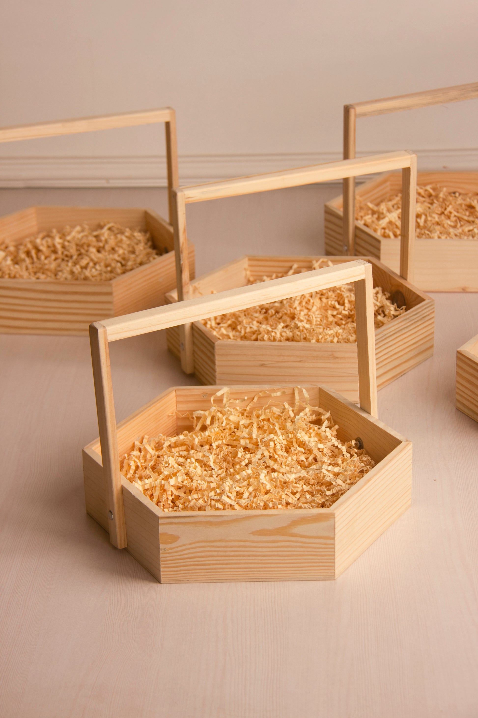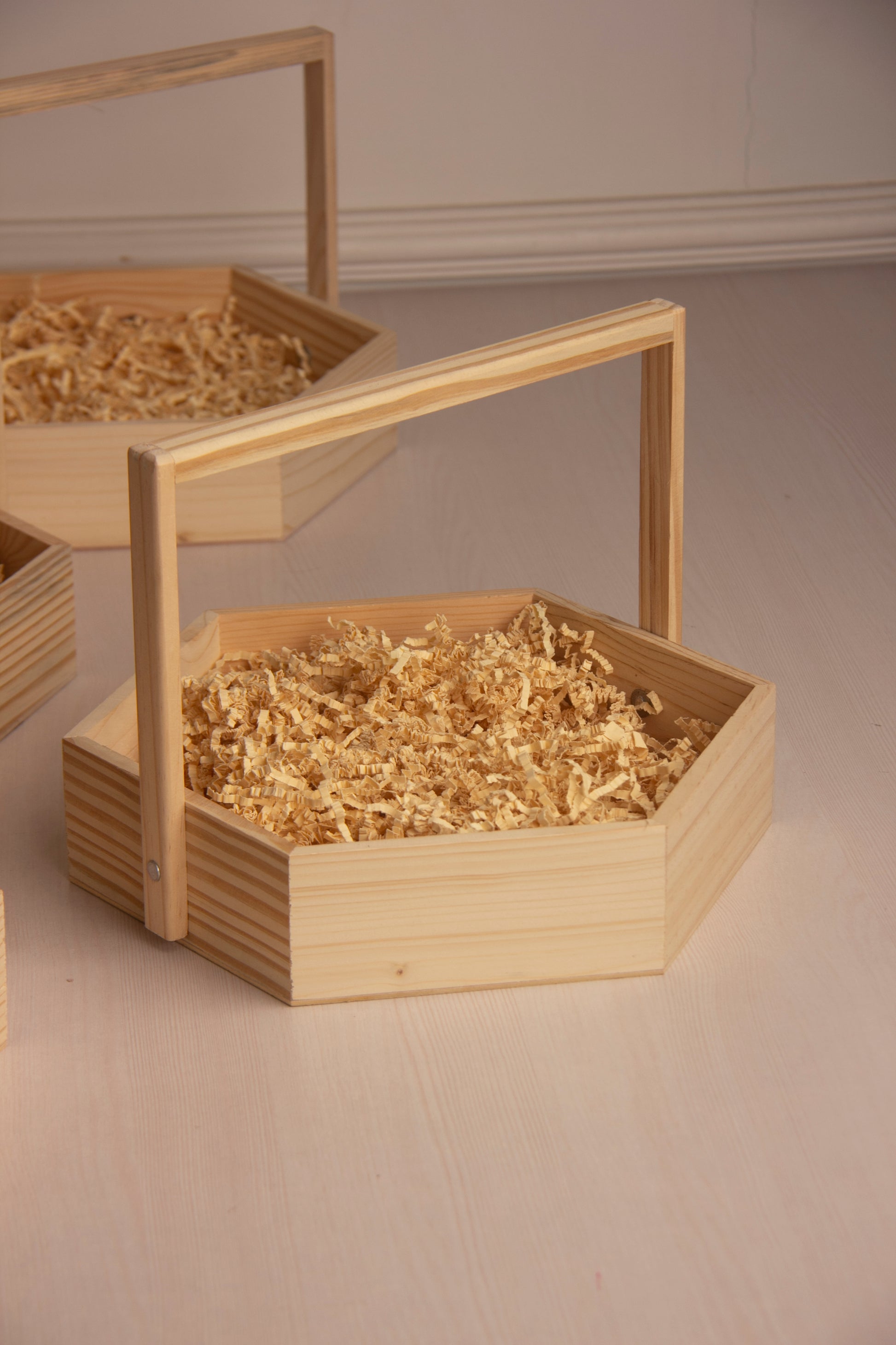 Our Pinewood Hexagon Basket is the ultimate one-stop solution for creating the perfect hamper. Expertly handcrafted from recycled wood and premium ply, this basket is designed to be both sturdy and sustainable. Unlike traditional options, fungus won't affect them, ensuring your gifts stay fresh and beautiful. Perfect for those who value quality and Indian craftsmanship, this basket is sure to add a touch of elegance to any occasion.