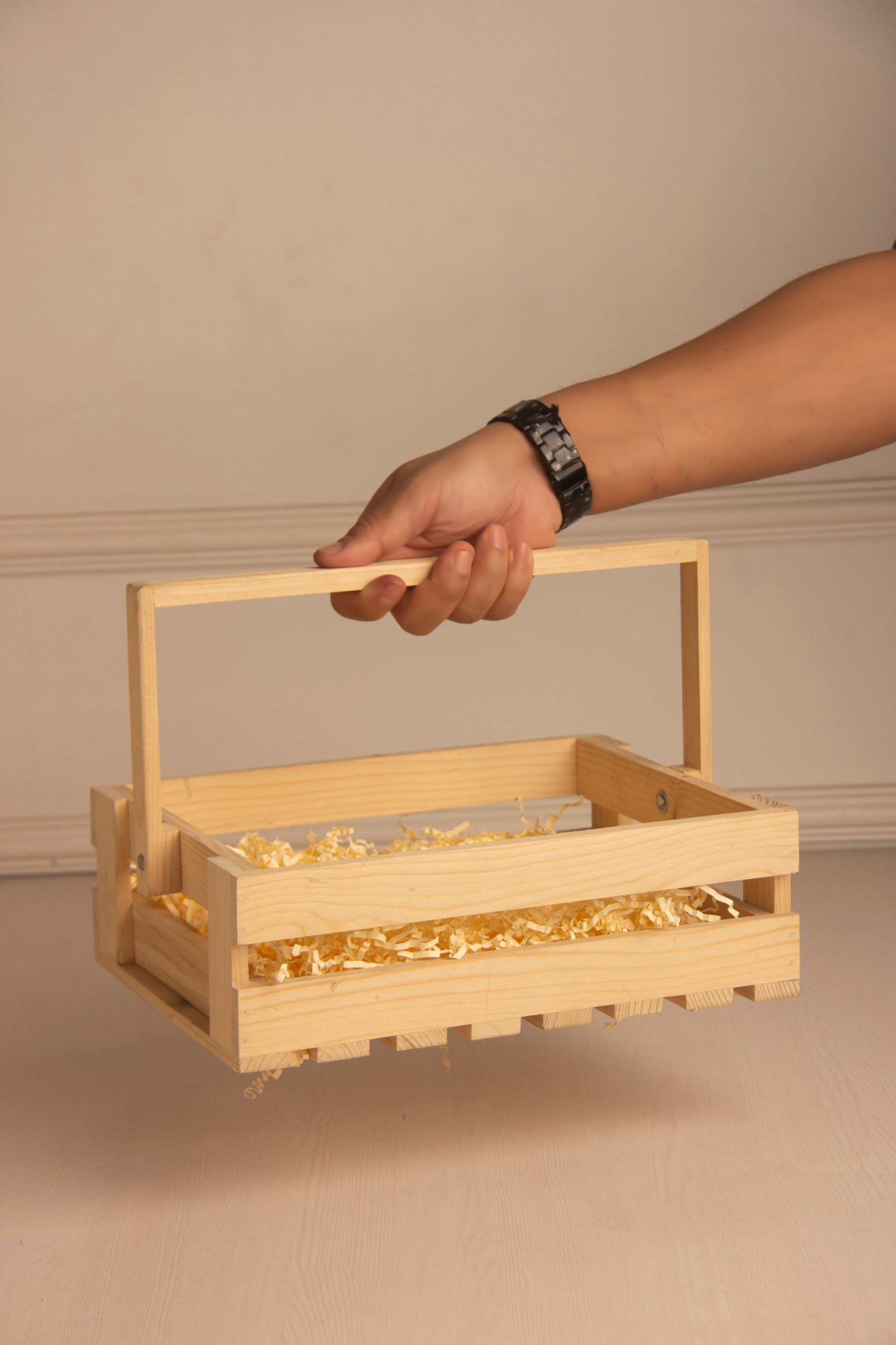 Crafted from natural pinewood, this rectangular gifting basket is a timeless packaging solution for all occasions. Designed with jute rope handles and filled with soft wood shavings, it provides a rustic yet elegant presentation for your festive hampers, jars, dry fruits, or handcrafted goods.