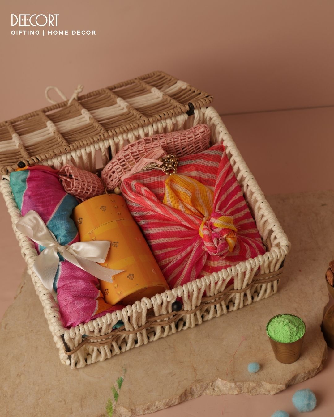 Celebrate Holi with a thoughtfully curated festive ensemble presented in a beautifully handcrafted raffia box. This vibrant collection features a traditional lehriya scarf, a paper tube jar filled with celebratory gulal, a raffia potli of premium dry fruits, and refreshing thandai to complete the festive experience. Paired with a warm Holi card, this hamper captures the essence of colour, tradition, and togetherness, making it an ideal choice for refined festive gifting, whether personal or corporate.