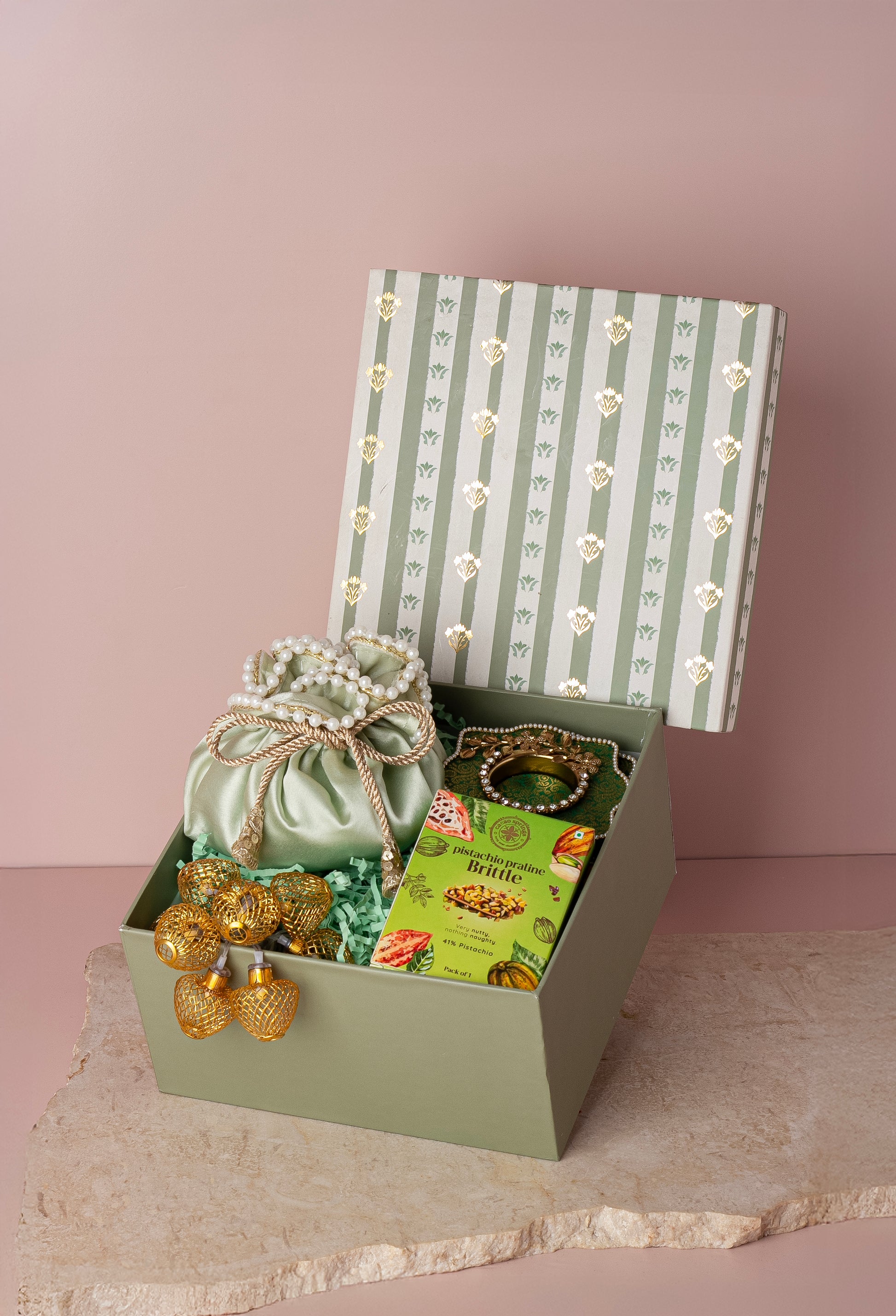Description - A sage green box, crowned with golden dried flowers, opens to a Diwali curation that feels soulful and celebratory. Fairy lights and brocade urli tealights bring a gentle shimmer, mogra-scented candles add fragrance to the air, while dry fruits and artisan chocolates weave in taste and indulgence. The Ruhani Hamper is crafted to bring light and warmth in a way that feels festive and personal. Add a customised note to carry your wishes in your own words.