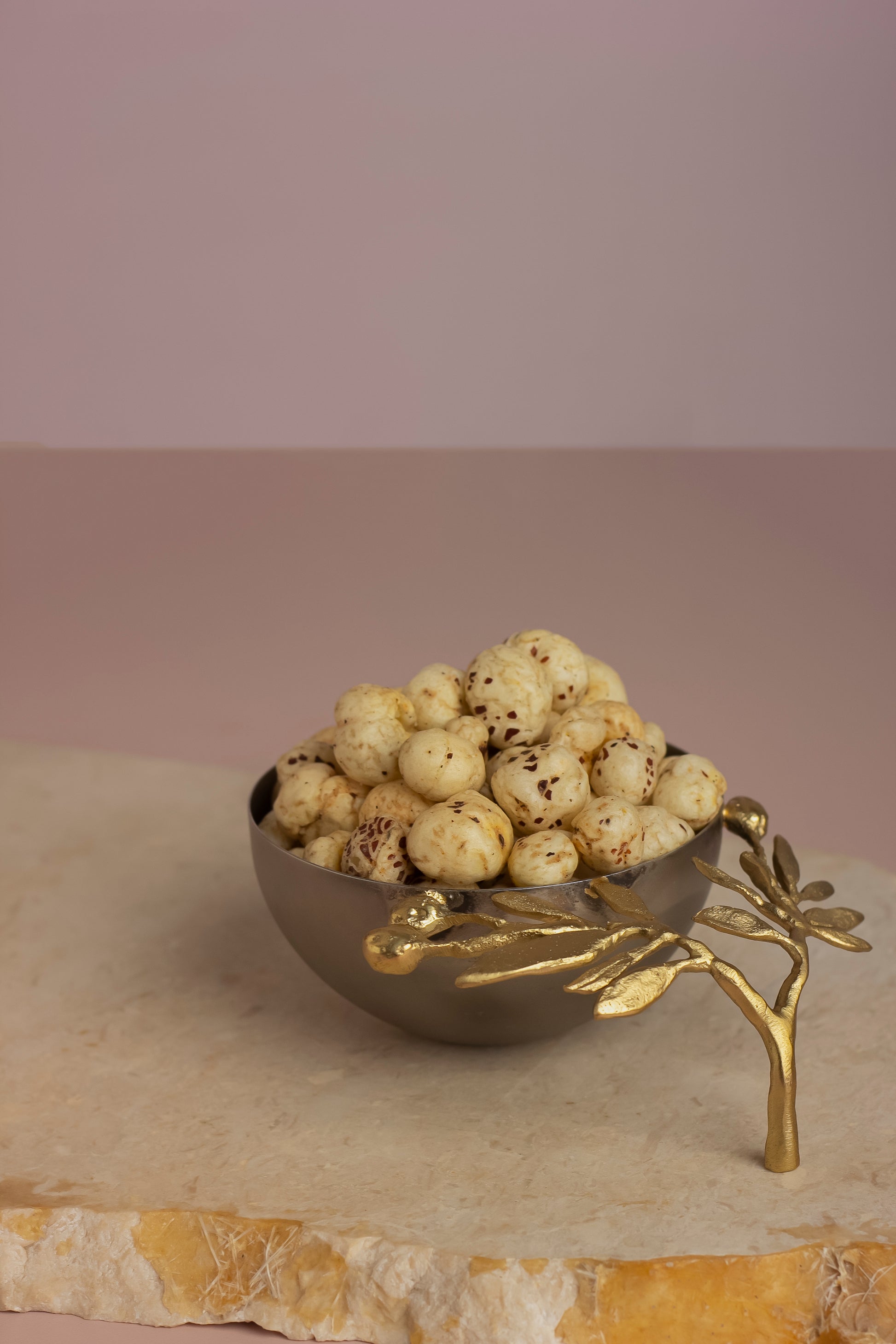 A perfect blend of modern steel and timeless brass, this bowl set is crafted with exquisite Winterberry Shrub detailing. The sleek steel bowl rests gracefully on a brass branch-inspired handle, paired with a matching spoon that mirrors the same organic charm. Ideal for serving condiments, desserts, or dry fruits, it brings an artisanal touch to your table with its unique design and fine craftsmanship.